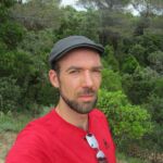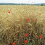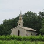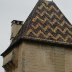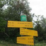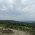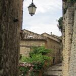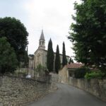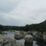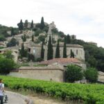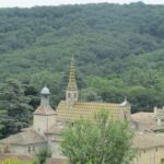 Chartreuse de Valbonne is a 13th century monastry – I liked the funky yellow and black zigzag patterns on the roofs. After eating lunch in the grounds, I cycled over a hill to drop down through the small village of St Michel d’Euzet (roadside flowers and steel cross) on to the fascinating limestone formations of the River Cèze (the ‘Cascades du Sautadet’) and the scenic village of La Roque sur Cèze (which included an art display of photorealistic paintings).